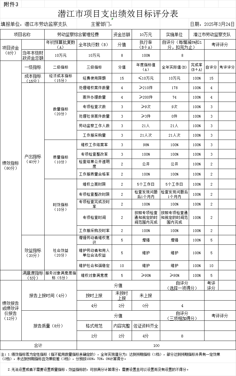 1.“劳动保障监察综合管理经费”绩效目标情况:经费使用10万元;处理维权案件数量178件,案件办理数量74件,专项检查次数9次,处理社保案件数量0件,劳动监察工作人数21人,工作服装采购量21人次;维权工作结案率100%,专项检查整改率100%,检查结果公开,工作服质量合格率100%;维权立案在5个工作日内,专项检查整改时限在检查发现问题后1个月内,专项检查完成及时率100%,专项检查时间按照专项检查通知规定的时间范围内完成,工作服采购及时率100%;增强劳动者维权意识,维护劳动者和用人单位合法权益,维护社会和谐稳定;维权对象满意度≥90%。