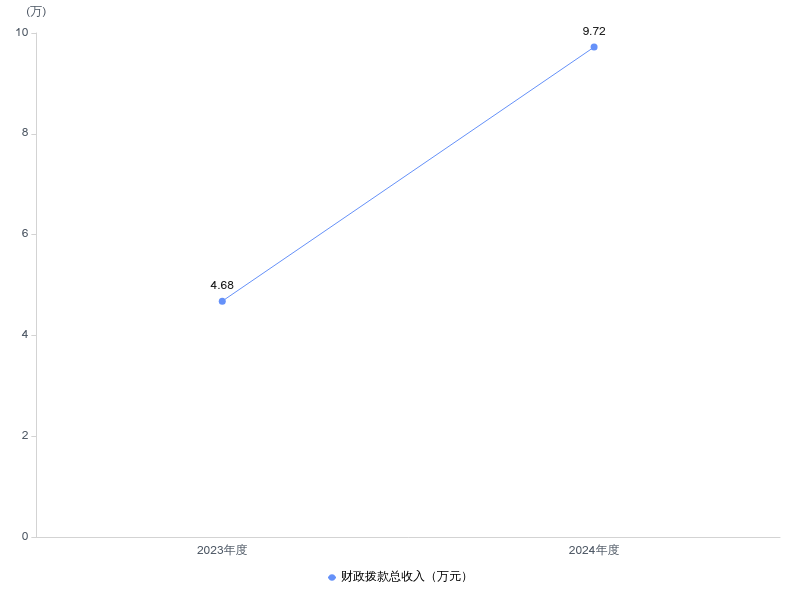 2024年度财政拨款收、支总计均为9.72万元。与2023年度相比,财政拨款收、支总计各增加5.04万元,增长107.7%。主要原因是2023年2-4季度岗位补贴实际在2024年度拨款支出。
