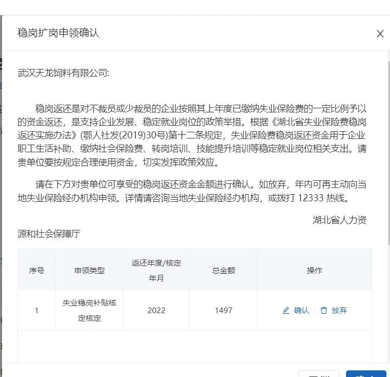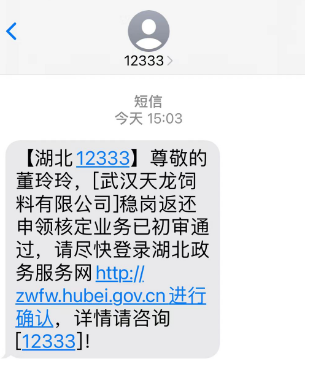 今年稳岗返还资金发放增加了企业确认环节,业务经办流程如下所示:失业科对企业进行稳岗返还经办,审核操作后,系统将自动向企业法人和经办人发送短信,提醒用企业账号登录湖北政务网进行确认(图1),企业登录湖北政务网,进入企业职工养老保险信息系统后会弹出稳岗返还确认窗口(图2、图3),企业确认后,可享受2023年失业保险稳岗返还。
