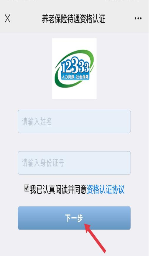 5.输入需进行待遇资格认证者的“姓名”和“身份证号码”,勾选“我已认真阅读并同意”,然后点击“下一步”
