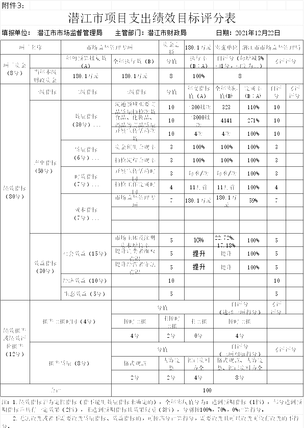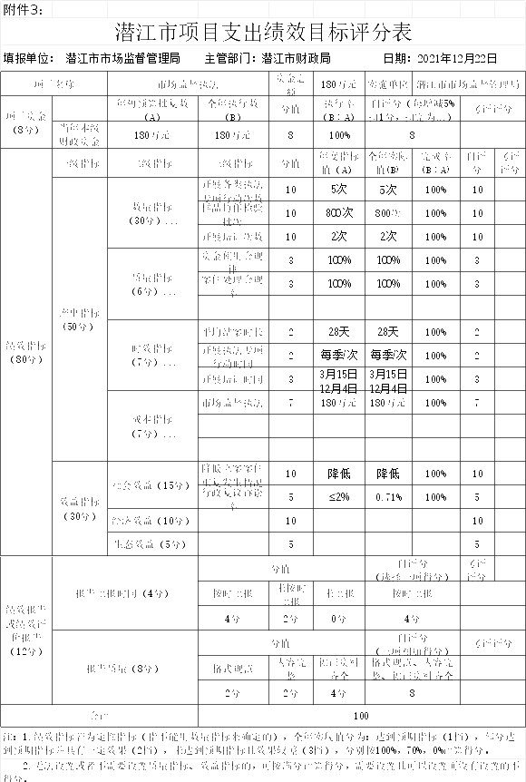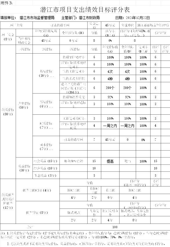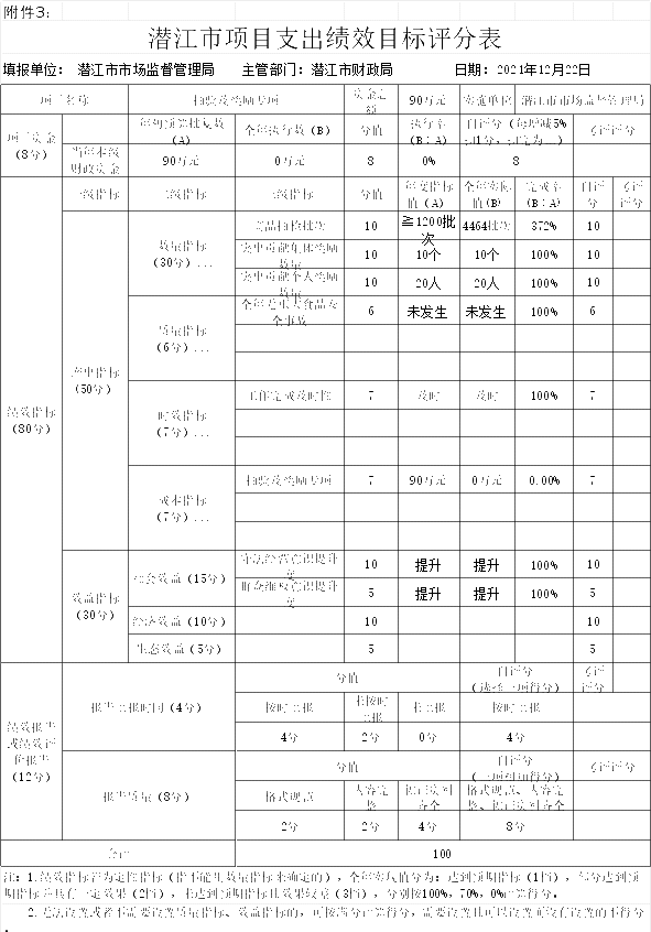 该项目实施单位是潜江市市场监督管理局,实施周期是2021年度,项目主要市场监督管理专项支出,根据是否完成年初制定的工作任务及按标准、按要求及时高效的完成任务来进行自评。