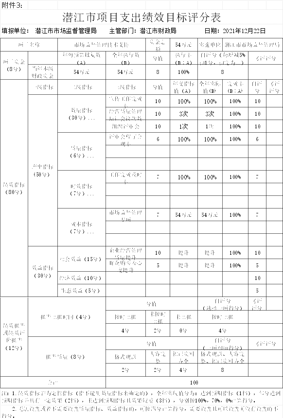 成本指标:市场监督管理技术支持年度指标值为54万元,全年实际值54万元,完成率100%。