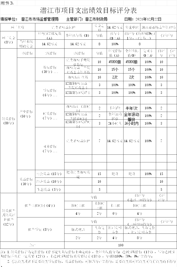 该项目实施单位是潜江市市场监督管理局,实施周期是2021年度,项目主要消费者权益保护支出,根据是否完成年初制定的工作任务及按标准、按要求及时高效的完成任务来进行自评。