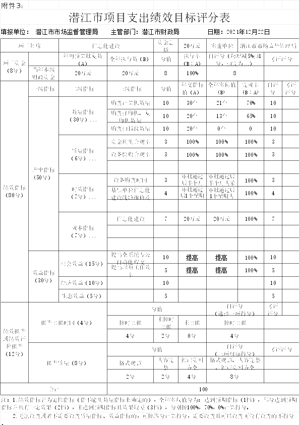 该项目实施单位是潜江市市场监督管理局,实施周期是2021年度,项目主要市场监督执法支出,根据是否完成年初制定的工作任务及按标准、按要求及时高效的完成任务来进行自评。