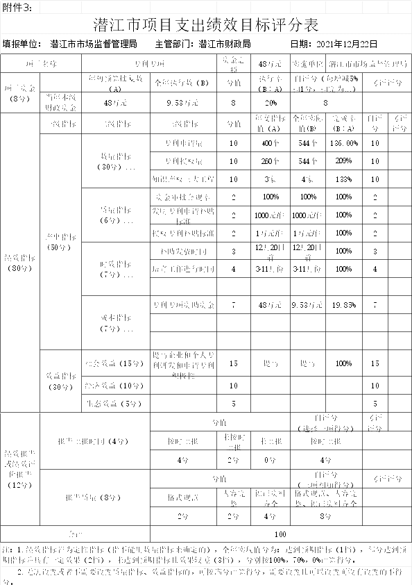 我局专利专项资助资金项目支出绩效自评分为100分。