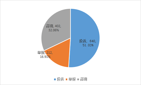 2023年第一季度,全市12315系统处理消费者诉求共计1254件,其中投诉640件、举报212件、咨询402件,分别占12315诉求总量的51.03%、16.91%和51.03%(见图一)。