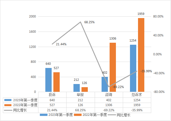 2023年第一季度,消费者总诉求量比上年同期下降了35.99%。呈现以下特点: