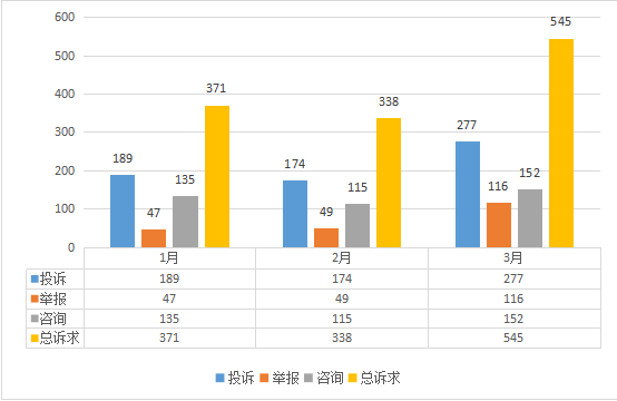 (二)3月诉求总量最高,1月和2月诉求总量基本持平。其中,3月受“3·15国际消费者权益日”影响,诉求量为第一季度最高(见图四)。