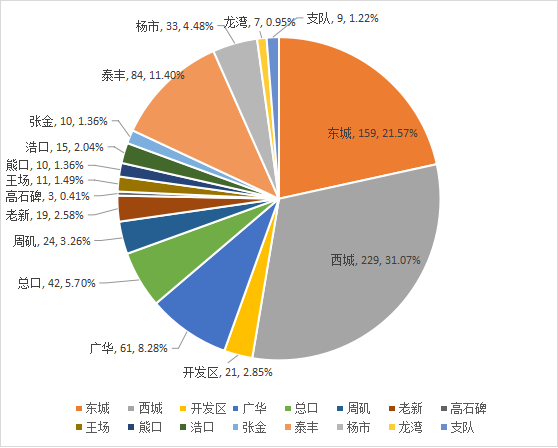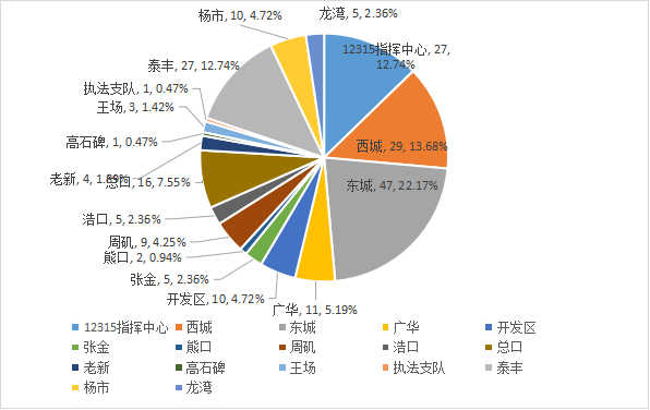 2023年第一季度,共接收举报212件,占诉求总量的16.91%,比上年增加86件,同比增加68.25%。从举报类型看,主要涉及违反广告法、价格法、食品法三类法规。从承办单位看,东城监管所(47件)、西城监管所(29件)、泰丰监管所(27件)承办的举报量排名前三,分别占举报总量的22.17%、13.68%、12.74%。其他监管所承办消费者举报的比例图如下(见图六)。