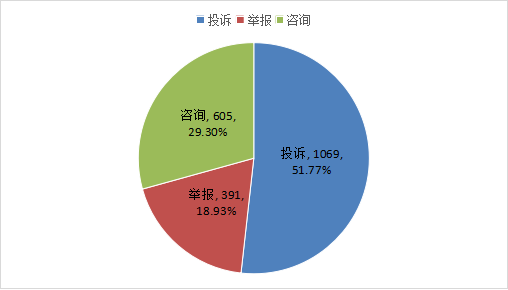 (一)投诉较上年同期呈下降趋势。举报和咨询较上年同期均呈上升趋势,投诉同比下降幅度和举报和咨询同比增长幅度均不大(见图三)。