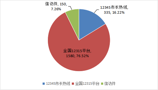 其中,全国12315平台受理消费者诉求1580件、12345市长热线受理消费者诉求335件、信访平台和邮寄受理消费者诉求150件,分别占12315系统受理诉求总量的76.52%、16.22%和7.26%(见图二)。