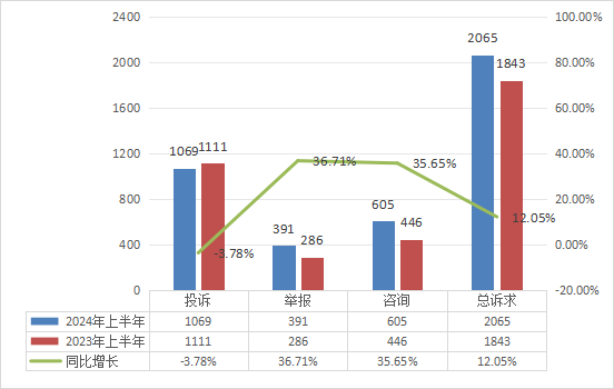 2024年第三季度,消费者总诉求量比上年同期增长了12.05%。呈现以下特点: