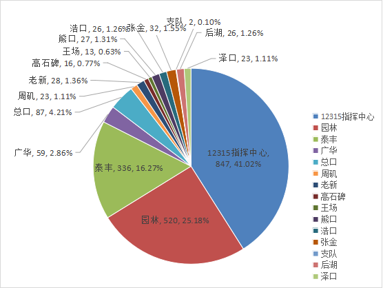 2024年第三季度,全市系统受理的诉求除由12315指挥中心直接现场答复的咨询605件和投诉举报自办件242件,其他诉求均由执法支队和市场监督管理所办理。其中,执法支队和监管所办理诉求1218件,占诉求总量的58.98%,园林市场监管所(520件)、泰丰市场监管所(336件)、总口市场监管所(87件)承办的诉求量在各单位中排名前三(见图五、表一)。