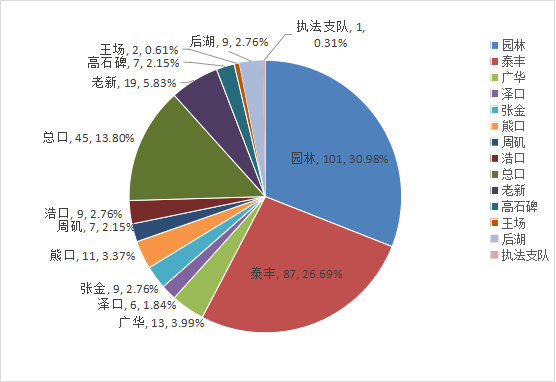2024年第三季度,共接收举报391件,占诉求总量的18.93%,比上年同期增加105件,同比增长率为36.71%。从举报类型看,主要涉及违反食品安全法、广告法、反不正当竞争法三类法规问题。从承办单位看,从承办监管所看,园林监管所(101件)、泰丰监管所(87件)、总口监管所(45件)承办的举报量排名前三,分别占举报总量的25.83%、22.25%、11.51%。其他监管所承办消费者举报的比例图如下(见图六)。