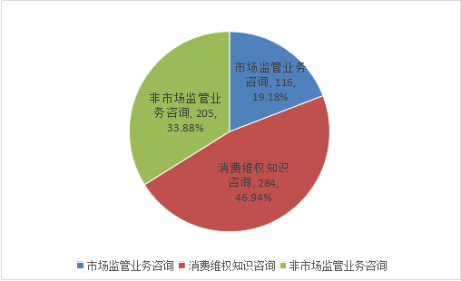 2024年第三季度,全国12315平台共接收消费者咨询605件,占诉求总量的29.30%,比上年同期增加159件,同比增长35.65%。其中非市场监管业务咨询205件,占咨询总量的33.88%;消费维权知识咨询284件,占咨询总量的46.94%;市场监管业务咨询116件,占咨询总量的19.18%(见图七)。