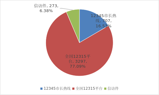 2025年上半年,全市12315系统处理消费者诉求共计4277件,投诉2440件、举报766件、咨询1071件,分别占12315诉求总量的57.05%、17.91%和25.04%(见图一)。其中,全国12315平台受理消费者诉求3297件、12345市长热线受理消费者诉求707件、信访平台和邮寄受理消费者诉求273件,分别占12315系统受理诉求总量的77.09%、16.53%和6.38%(见图二)。