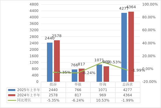 2025年上半年,消费者总诉求量比上年同期下降1.99%。呈现以下特点: