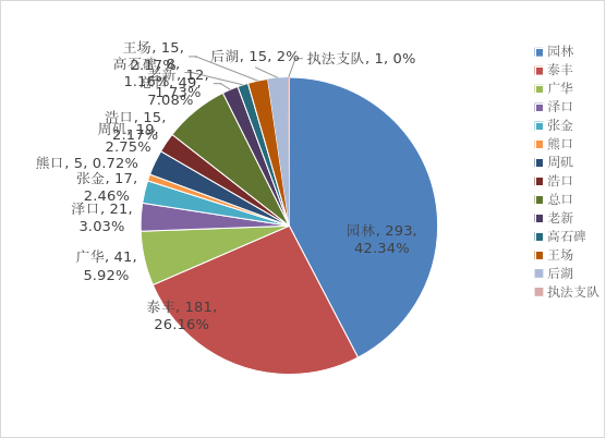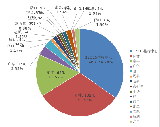 (二)从承办单位看。园林监管所(293件)、泰丰监管所(181件)、总口监管所(49件)承办的举报量排名前三,分别占承办单位办理举报量的38.25%、23.62%、6.39%,合计占承办单位办理举报量的68.26%,承办单位接收消费者举报的比例图如下(见图六)。