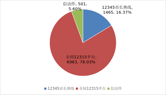 其中,全国12315平台受理消费者诉求6983件、12345市长热线受理消费者诉求1465件、信访平台和邮寄受理消费者诉求501件,分别占12315系统受理诉求总量的78.03%、16.37%和5.60%(见图二)。