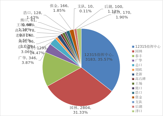 2025年,全市系统受理的诉求除由12315指挥中心直接处理的3183件,其他诉求由执法支队和市场监督管理所办理。执法支队和监管所办理诉求5766件,占诉求总量的64.43%,园林市场监管所(2804件)、泰丰市场监管所(1295件)、广华市场监管所(346件)承办的诉求量在各单位中排名前三(见图五、表一)。