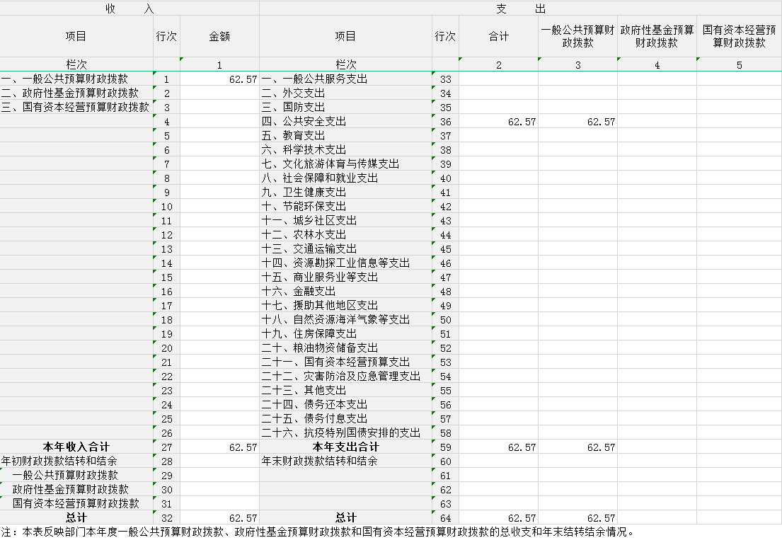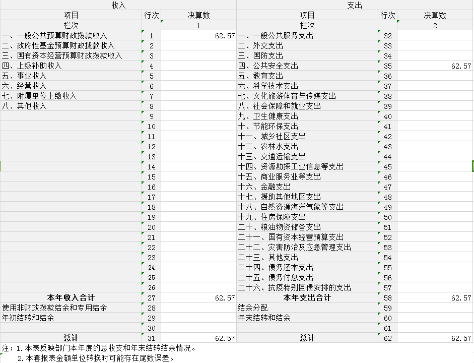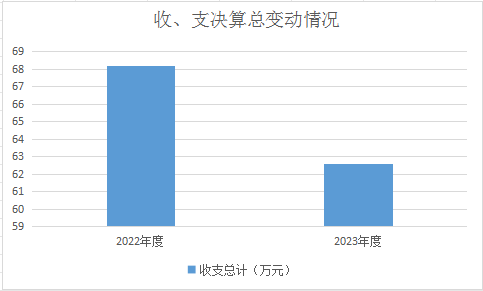 2023年度收、支总计均为62.57万元。与2022年度相比,收、支总计各减少5.65万元,下降8 %,主要原因是公证业务办证数量和收费降低,同时公证人员经费减少。