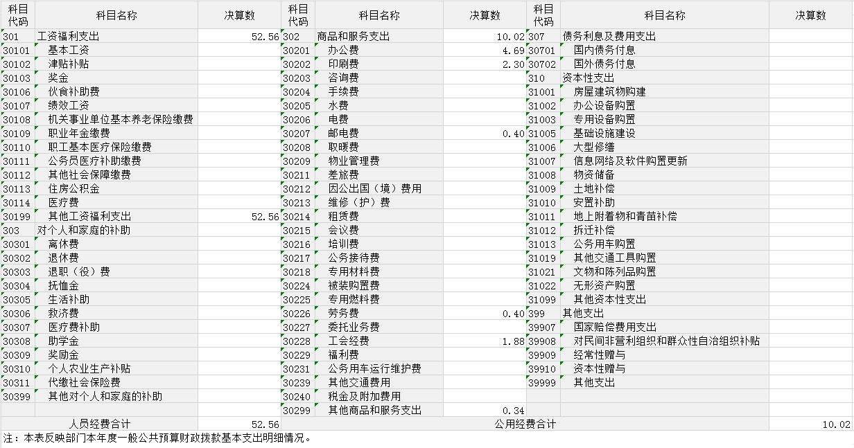 公用经费10.02万元,主要包括:办公费、印刷费、邮电费、差旅费、劳务费、工会经费、其他商品和服务支出。