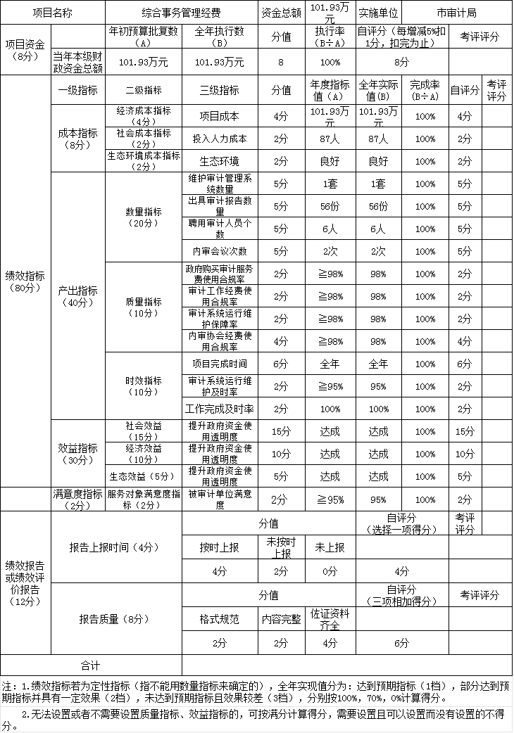 2、年度绩效目标。根据本单位职能和三定工作安排,完成审计署、审计厅和市政府安排的各项审计工作,做到严明纪律和加强审计廉政建设,保障系统正常运行,保障审计工作正常开展,实现审计监督全覆盖,推动财政资金合理配置、高效使用,加速地方经济建设发展,需申请项目经费101.93万元,该项目属于2024年常年性项目。在编报2024年度部门预算时,项目实施单位申报并经审核批复的该项目年度绩效目标如下: