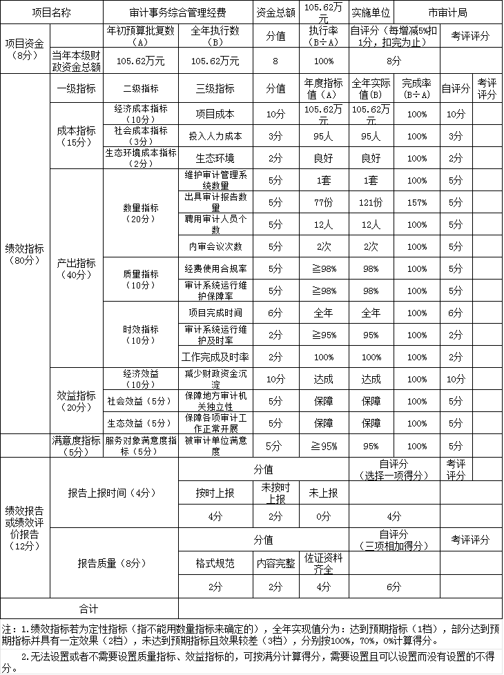 (2)质量指标:保障各项职能工作正常运转,审计程序合规、完整,市政府考核等级良好。