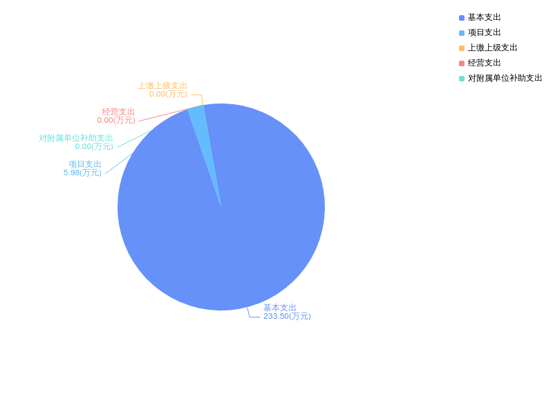 2024年度支出合计239.48万元,与2023年度相比,支出合计减少48.94万元,下降17.0%。其中:基本支出233.50万元,占本年支出97.5%;项目支出5.98万元,占本年支出2.5%;上缴上级支出0.00万元,占本年支出0.0%;经营支出0.00万元,占本年支出0.0%;对附属单位补助支出0.00万元,占本年支出0.0%。