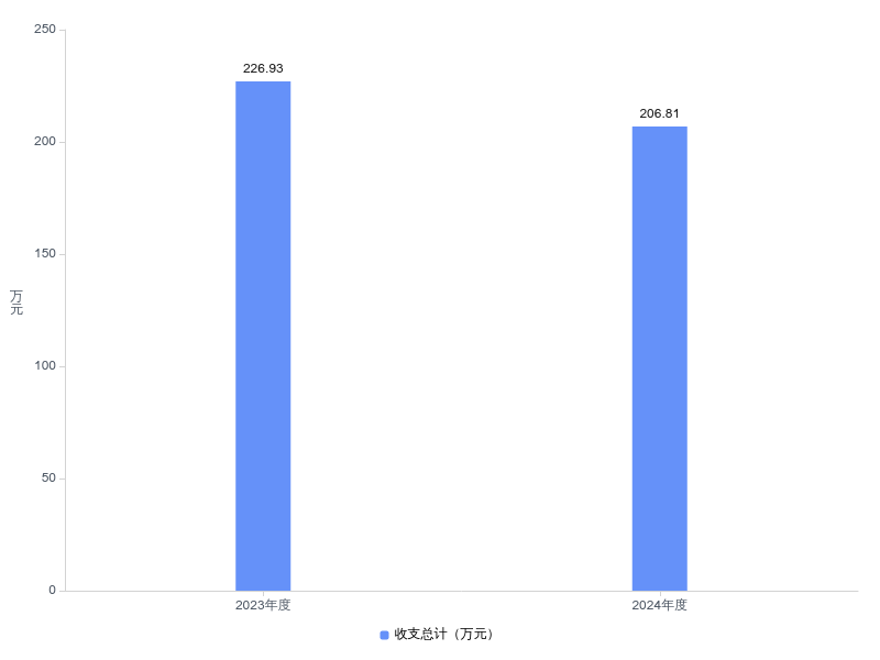 2024年度收、支总计均为206.81万元。与2023年度相比,收、支总计减少20.12万元,下降8.9%,主要原因一是上年度补缴了单位职业年金利息支出及补发以前度的绩效奖励支出,本年无此项支出;二是本单位机构体制改革后部分人员下放乡镇,本年度的收支相对应减少。