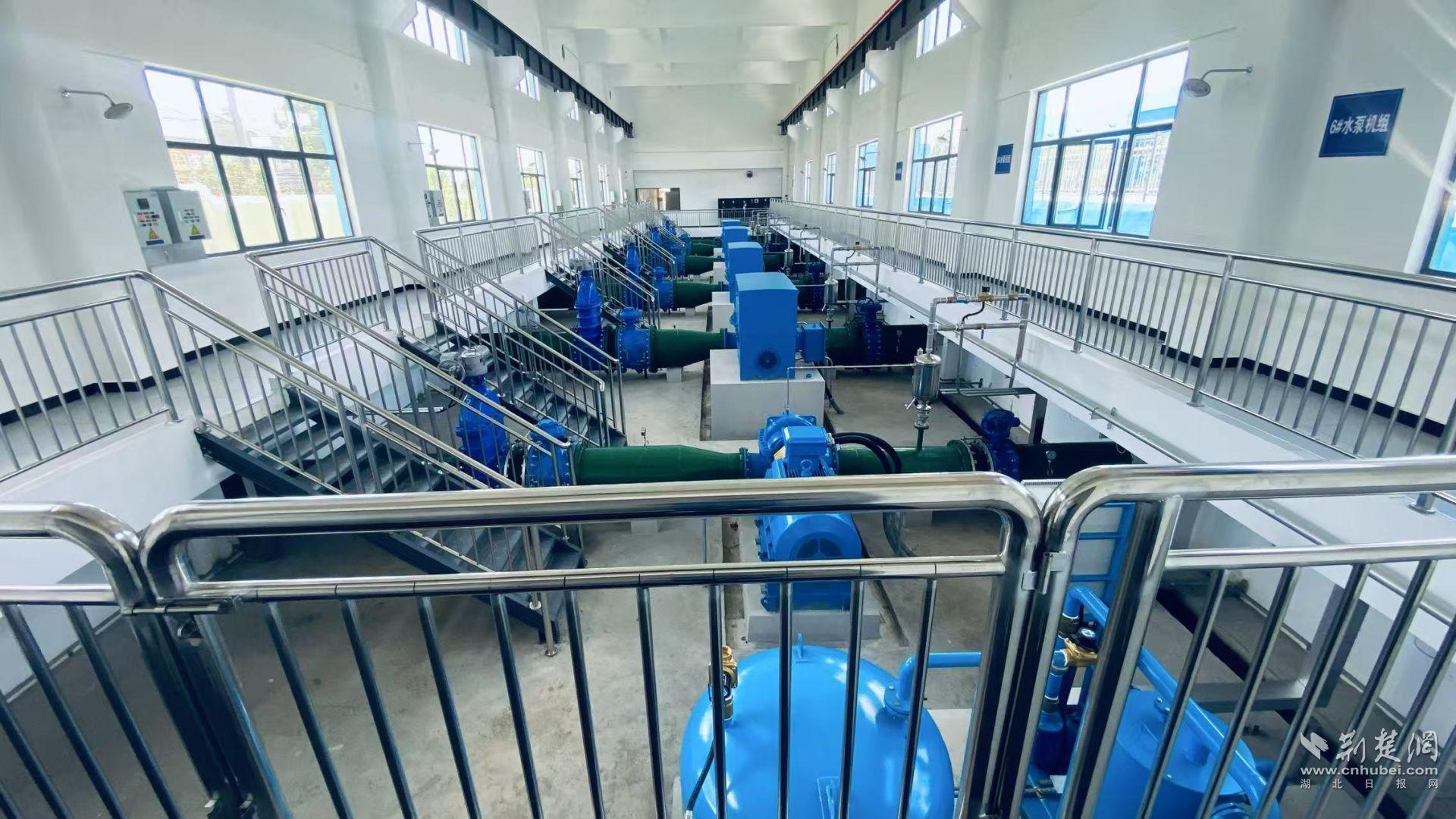 老新泵站全景潜江市老新二泵站为四湖流域统排泵站,总装机3×2400KW,设计排涝流量80m³s。该站以流域统排为主,减轻总干渠沿线和洪湖堤防的防洪压力。
