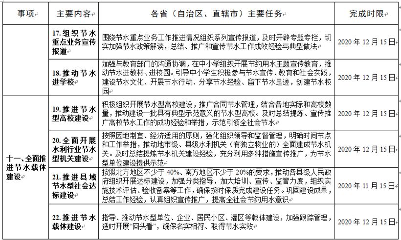 11.围绕“靠加大社会宣传力度,唤起全民节水意识”,重点抓节水理念普及。充分发挥各类媒体作用,开展“世界水日”“中国水周”和节水科普周等宣传活动。组织对节水重点业务工作推进情况进行系列宣传报道,总结推广和宣传节水工作成效经验与典型做法。与教育部联合面向全国中小学开展节约用水主题宣传教育,推动节水进教材、进校园、进机关、进社区,引领社会形成珍惜水、节约水和爱护水的良好风尚。各流域管理机构和各省级水行政主管部门要结合实际,制定本级节水宣传教育措施,加强节水形势宣传、知识普及和政策解读,引导广大中小学生积极参与节水宣传、教育和社会实践,不断提升全民节水意识。