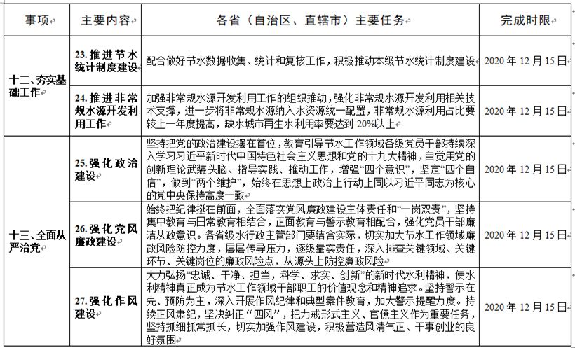 15.修订完善节水考核方案。分析当前节水考核存在的问题,完善节水考核有关事项,合理确定考核内容,改进考核方法,研究提出节水考核方案,进一步提高节水考核的针对性和科学性。各省级水行政主管部门应进一步研究完善节约用水相关考核内容和指标,强化节水考核结果应用。严重缺水地区要将节水作为约束性指标纳入政绩考核,进一步完善节水有关指标内容和权重。