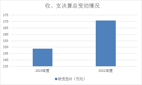 2023年度收、支总计均为148.88万元。与2022年度相比,收、支总计减少21.85万元,降低12.8%,主要原因是厉行节约。