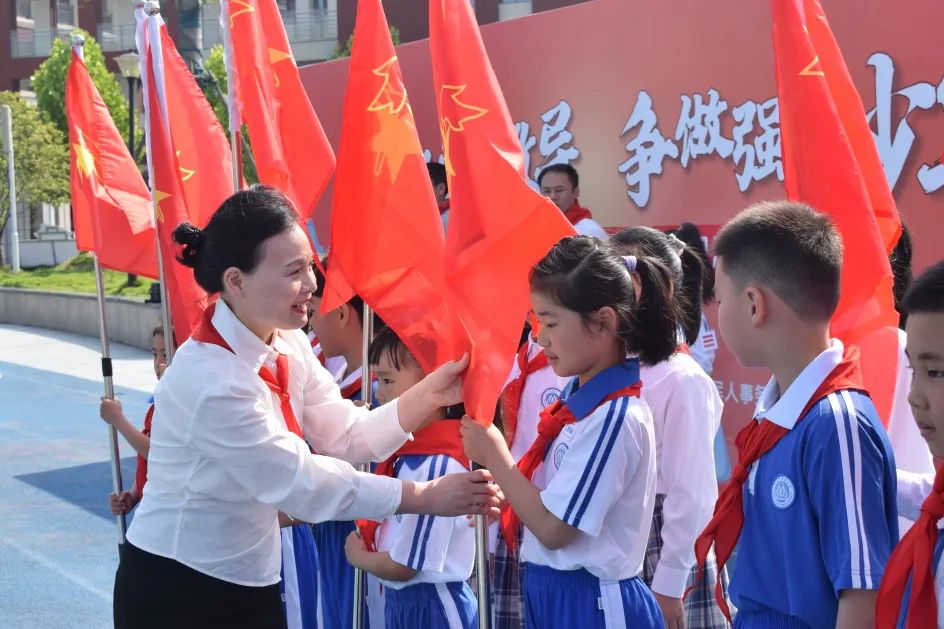 240名新队员在党团组织负责人、少先队辅导员和老队员的见证下,佩戴上鲜艳的红领巾,并在队旗下庄严宣誓,光荣地加入了中国少年先锋队。曹禺小学少工委主任袁伶俐为新建中队授中队旗、为新聘任少先队辅导员颁发聘书。