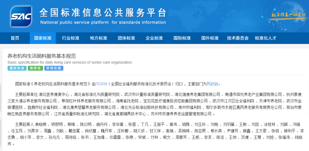 据悉,《规范》由湖北医养康复中心(湖北省荣军优抚医院)、湖北省标准化与质量研究院、武汉市计量标准质量研究院、湖北健康养老集团有限公司等多家单位共同起草,《规范》实施后对提升养老机构服务质量和安全保障,进一步增强老年人的获得感、幸福感、安全感具有重要意义。