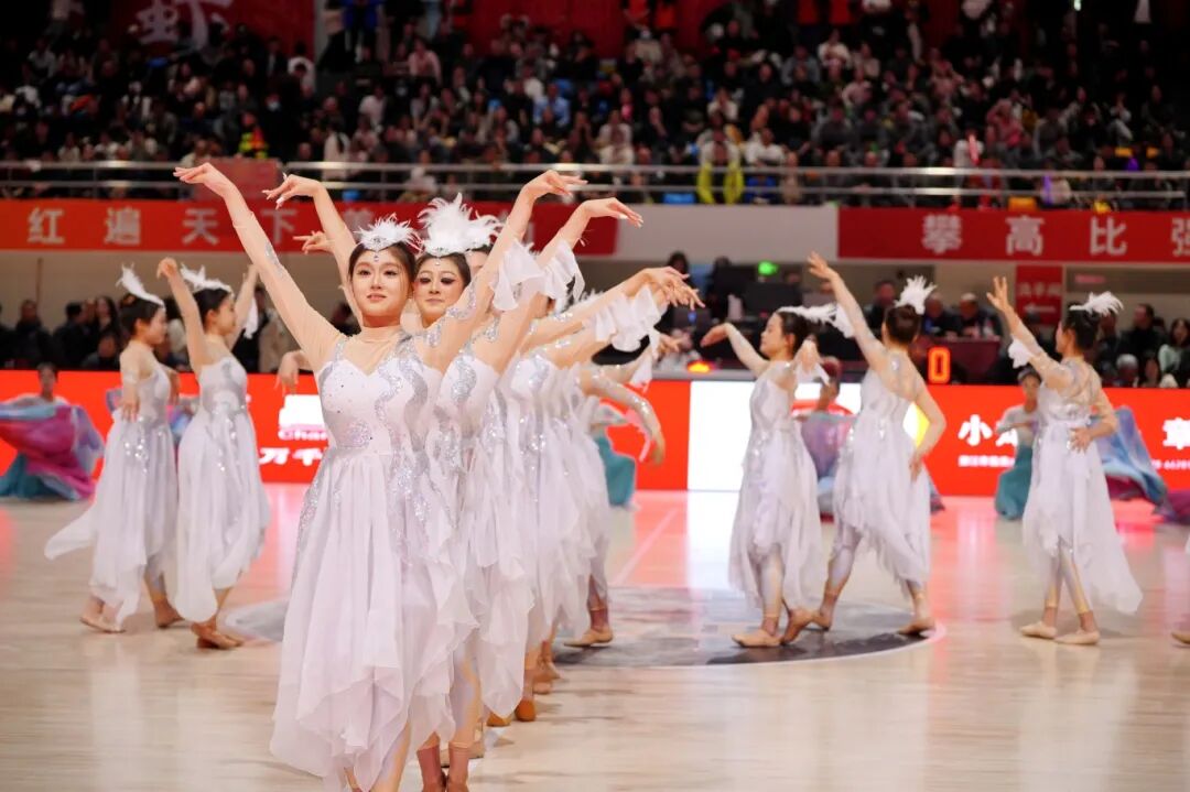 整场赛事不仅是球员的赛场较量,更是一场文体交融的盛宴。非遗舞蹈《龙腾纸悦》、少儿篮球表演《青衿逐光》、啦啦操《热血青春正燃烧》《潜江wave浪潮》、戏曲舞蹈《花鼓新韵》等节目轮番上演,为激烈的比赛增添了别样风采。