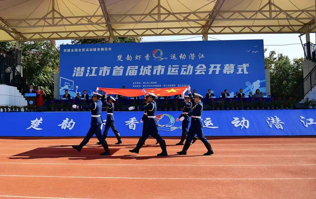 上午10时,曹禺中学泰丰校区体育场艳阳高照、微风和煦。伴随着《歌唱祖国》旋律,6名消防救援指战员高擎中华人民共和国国旗,昂首阔步走进体育场,紧随其后入场的是潜江市城市运动会会旗、潜江市首届城市运动会会旗。随后,裁判员方队和市直各部门、区镇街道、相关企业组织的50支代表团方队精神抖擞,意气风发步入运动场,向观众们挥手致意。现场观众用热烈的掌声和欢呼声欢迎他们的到来。