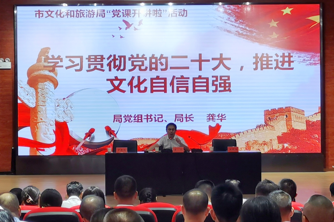 为深入贯彻落实党的二十大精神和习近平新时代中国特色社会主义思想,7月3日,市文化和旅游局举办庆祝中国共产党成立102周年暨局党组书记讲党课大会。局党组书记、局长龚华同志以《学习贯彻党的二十大 推进文化自信自强》为题讲授党课,局党组成员、工会主任伍晓梅同志主持会议,局机关全体干部职工、二级单位班子成员、全系统党员干部及纳新党员、社会组织代表等70余人参加会议。
