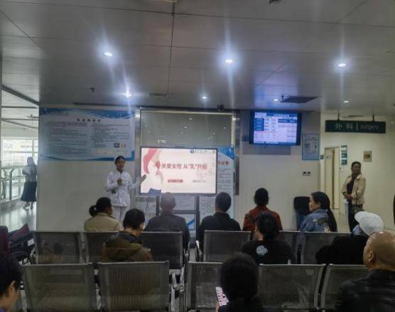 乳腺癌是威胁女性健康的主要疾病之一,其发病率位居女性恶性肿瘤之首。活动期间,医院甲状腺乳腺外科主管护士张雯为门诊患者及家属带来了一场题为《关爱女性,从“乳”开始》的健康科普讲座。她结合临床典型案例,通过图文并茂的演示,系统讲解了乳腺健康知识,重点介绍了乳腺癌的高危因素、常见症状、自我检查方法、筛查手段以及健康的生活方式对预防乳腺癌的重要性。“月经来潮后的7~10天是自我检查的最佳时间,此时乳腺受激素影响较小,更易发现异常变化。”张雯展示了乳房自检的标准化流程——“一看二触三对比”,指导女性掌握每月自我检查的正确方法。