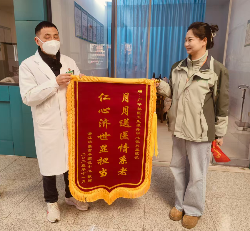 华美吉年颐悦中心负责人表示,赠送这面锦旗,代表了全体入住老人及机构工作人员的共同心声。广华社区卫生服务中心医护人员不仅以精湛的医术为老人们解除病痛,更以真诚的关爱温暖了他们的晚年生活。“月月送医”体现的是坚持与奉献,“情系老人”彰显的是初心与使命,“仁心济世显担当”则是对其职业精神的高度概括。