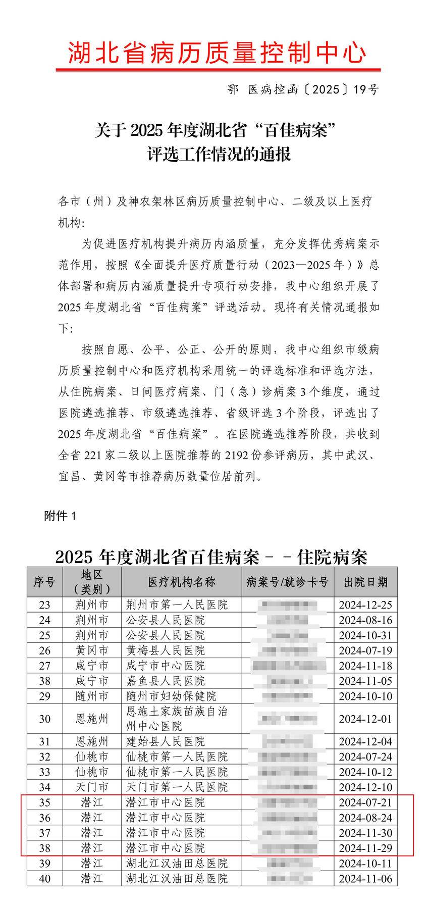近日,由湖北省病历质量控制中心组织开展的2025年度湖北省“百佳病案”评选结果正式揭晓,潜江市中心医院选送的4份住院病案从全省221家医院的2192份参选病案中脱颖而出,成功入选100份“百佳病案”(其中住院病案仅40份),获奖数量在全省同级医院中位居前列!