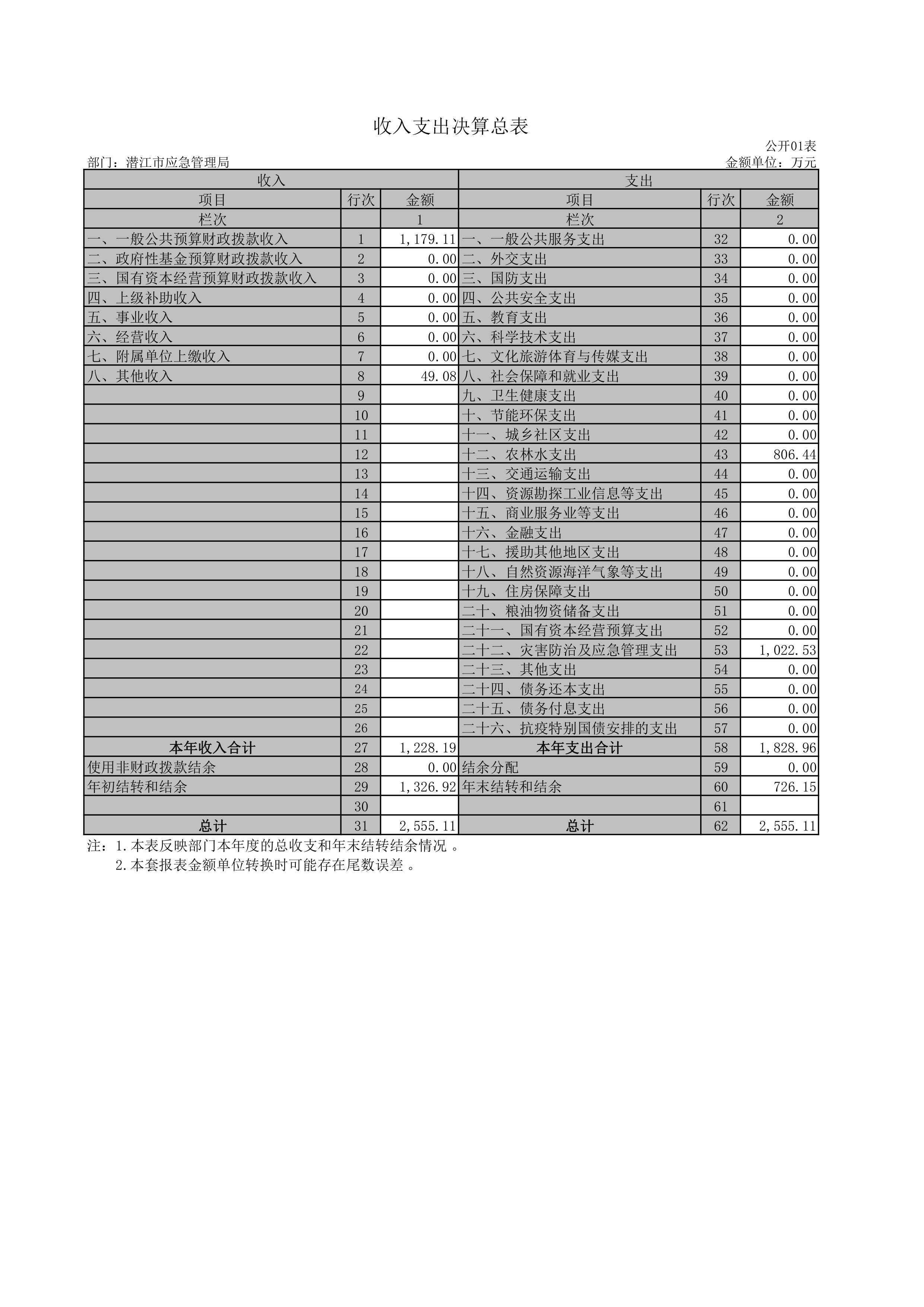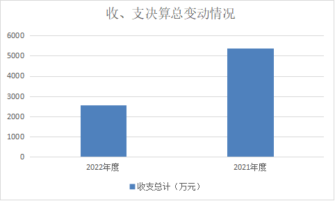 2022年度收、支总计均为2555.11万元。与2021年度相比,收、支总计各减少2809.68万元,下降52 %,主要原因是中央、省级项目资金减少。