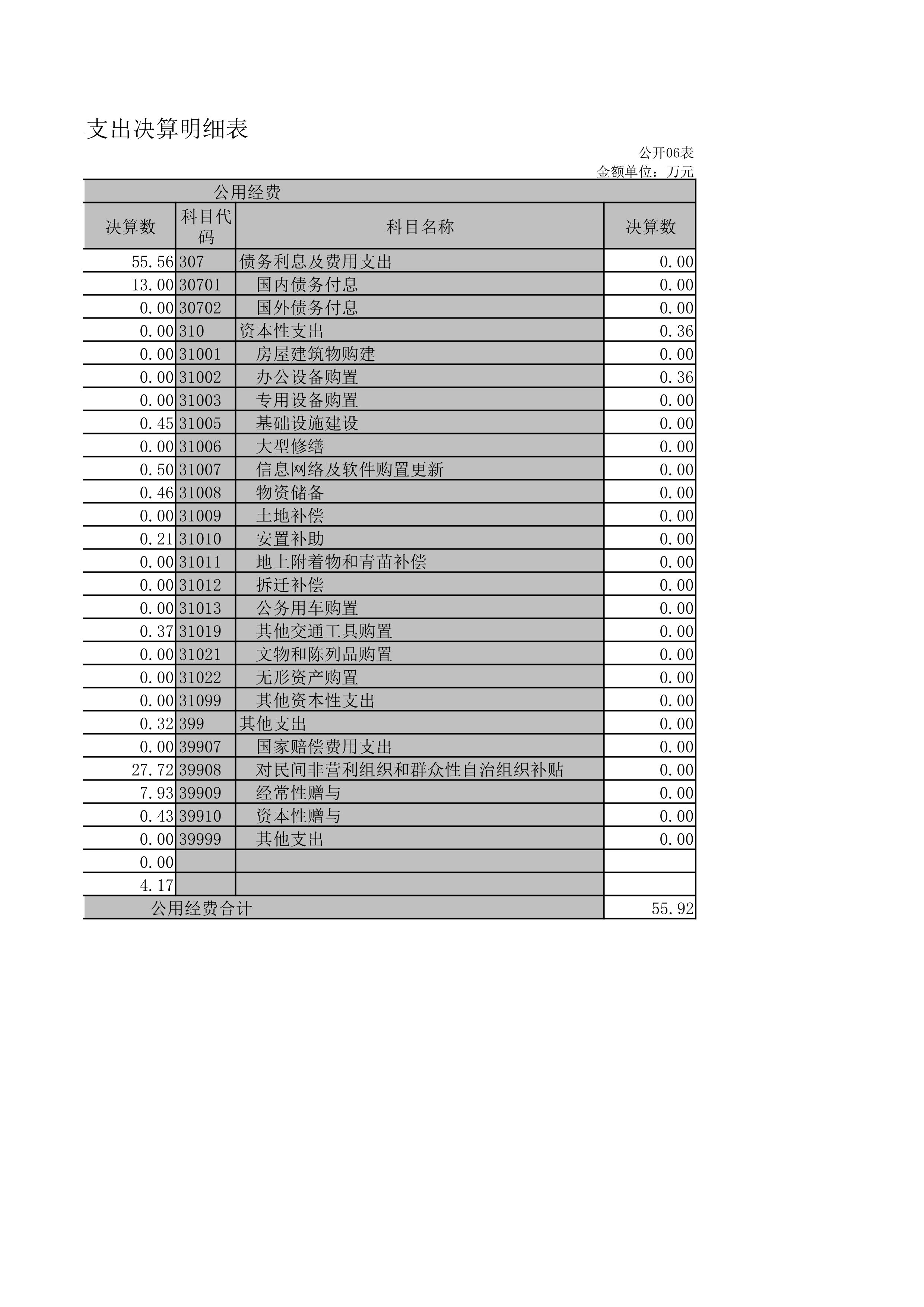 公用经费55.92万元,主要包括:办公费、印刷费、咨询费、手续费、水费、电费、邮电费、取暖费、物业管理费、差旅费、因公出国(境)费用、维修(护)费、租赁费、会议费、培训费、公务接待费、专用材料费、被装购置费、专用燃料费、劳务费、委托业务费、工会经费、福利费、公务用车运行维护费、其他交通费用、税金及附加费用、其他商品和服务支出、办公设备购置、专用设备购置、信息网络及软件购置更新、公务用车购置、其他资本性支出。