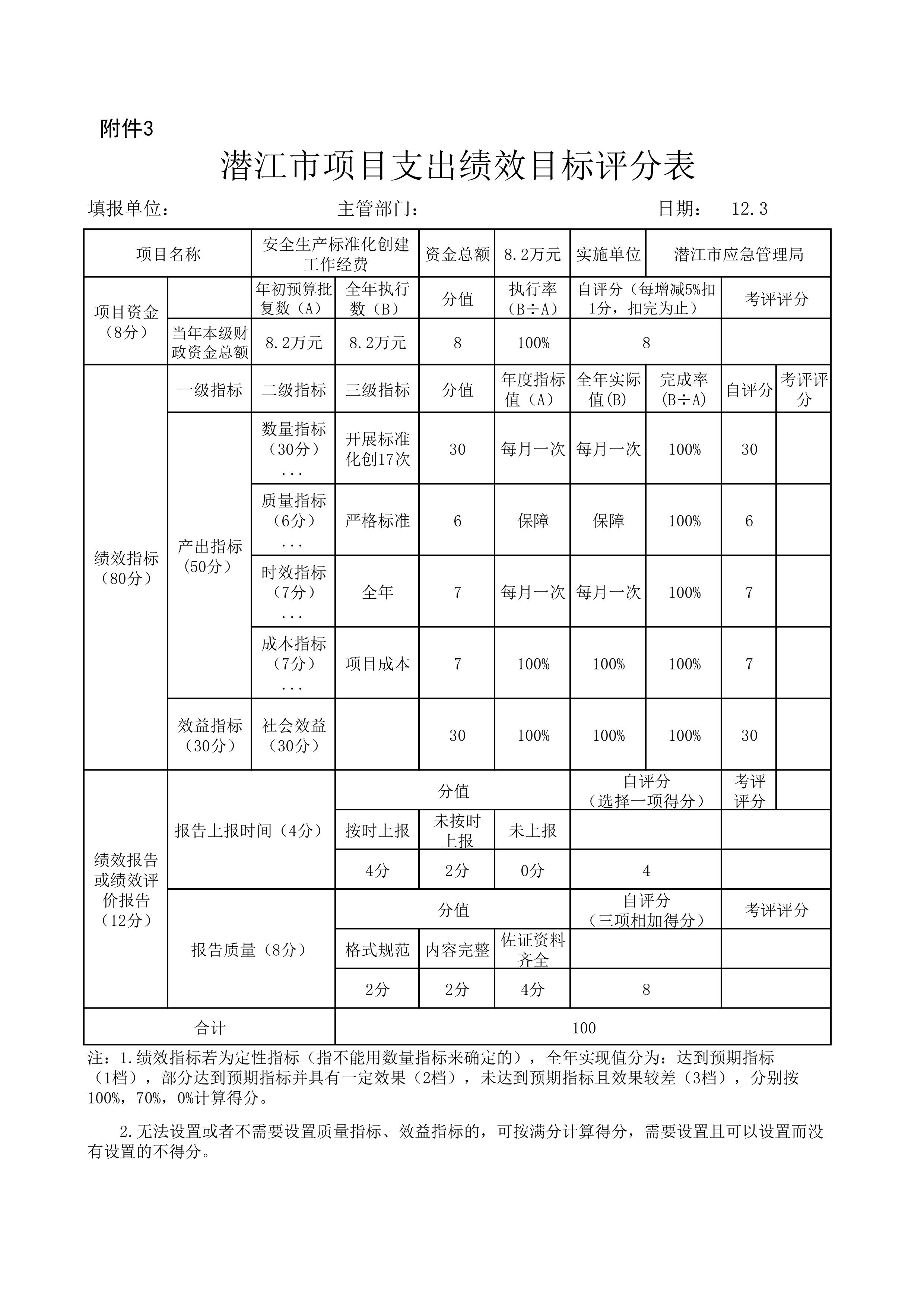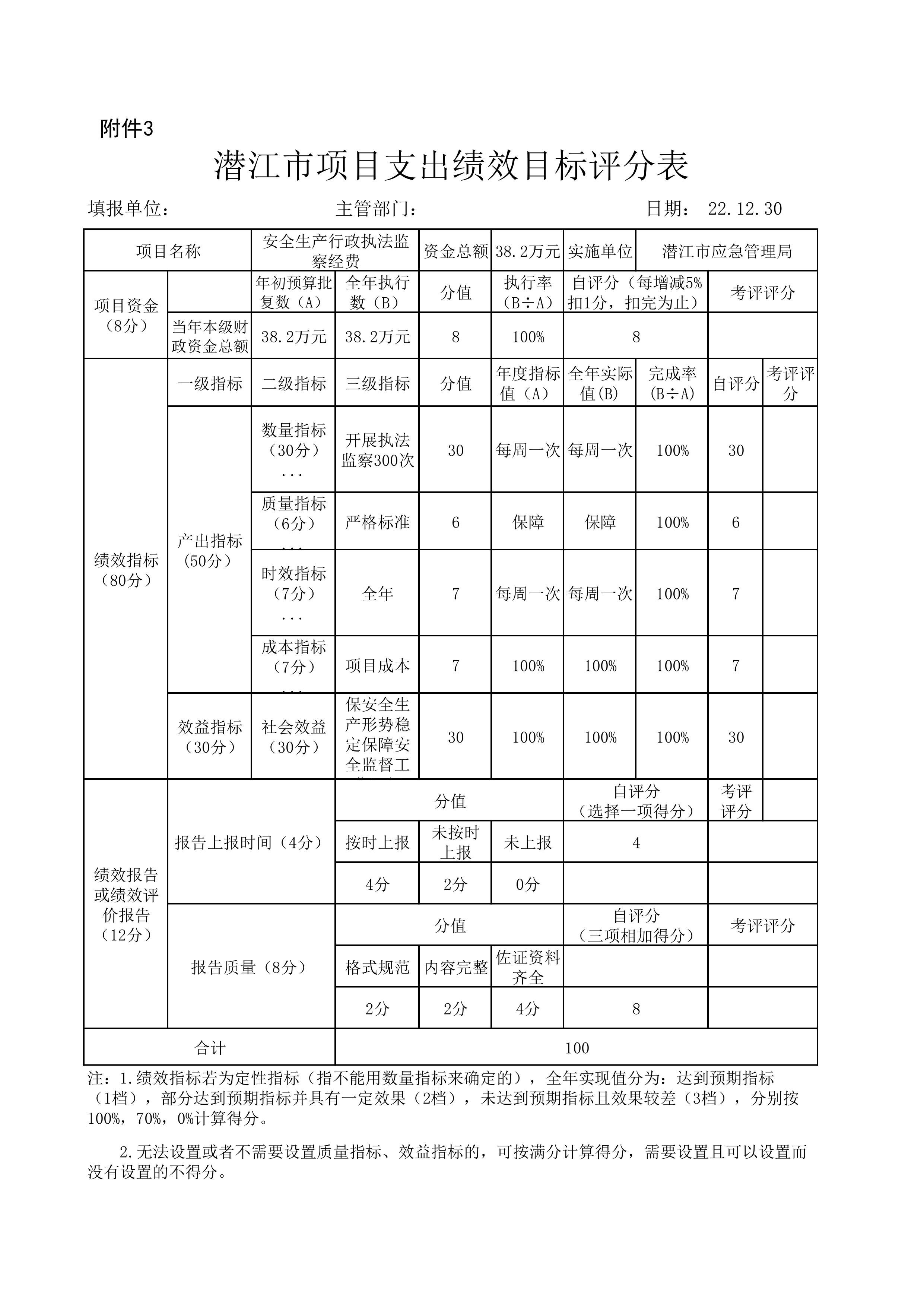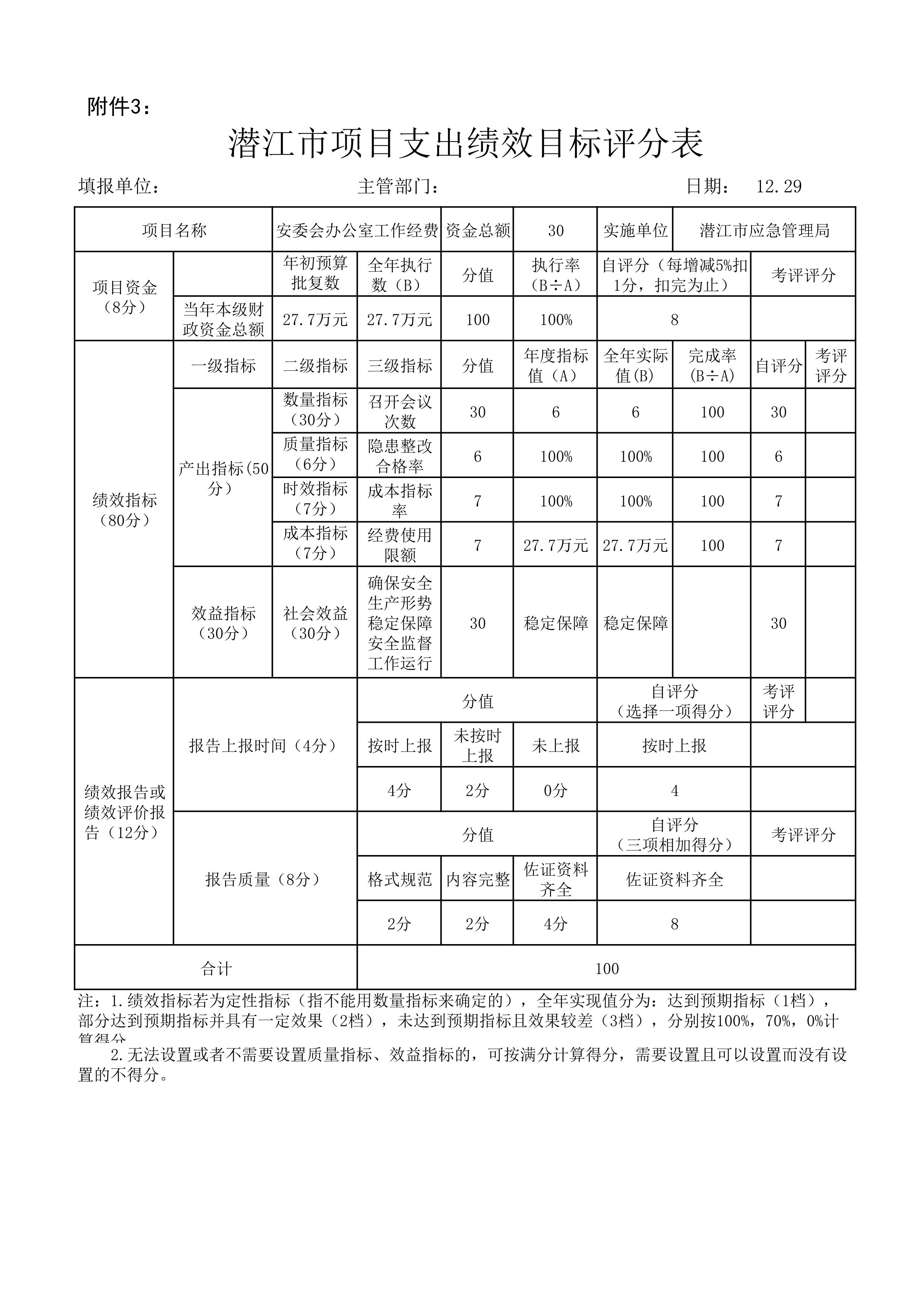 按照潜江市财政局《2022年预算绩效管理年度目标考核工作的通知》(潜财绩﹝2022﹞8号)的内容,结合本项目支出绩效目标完成情况,经过自查自评,2022年度安委会办公室工作经费自评得分100分。