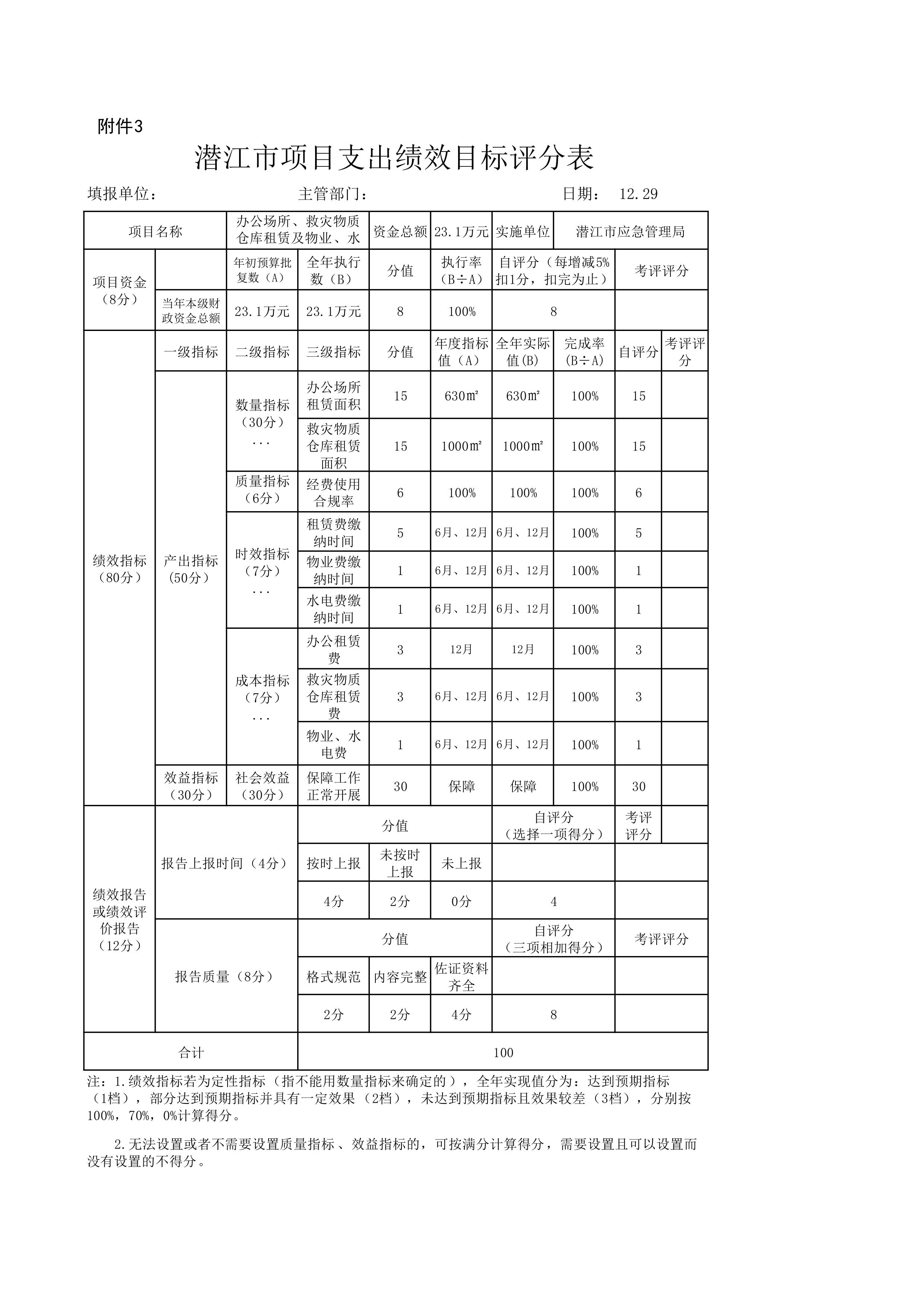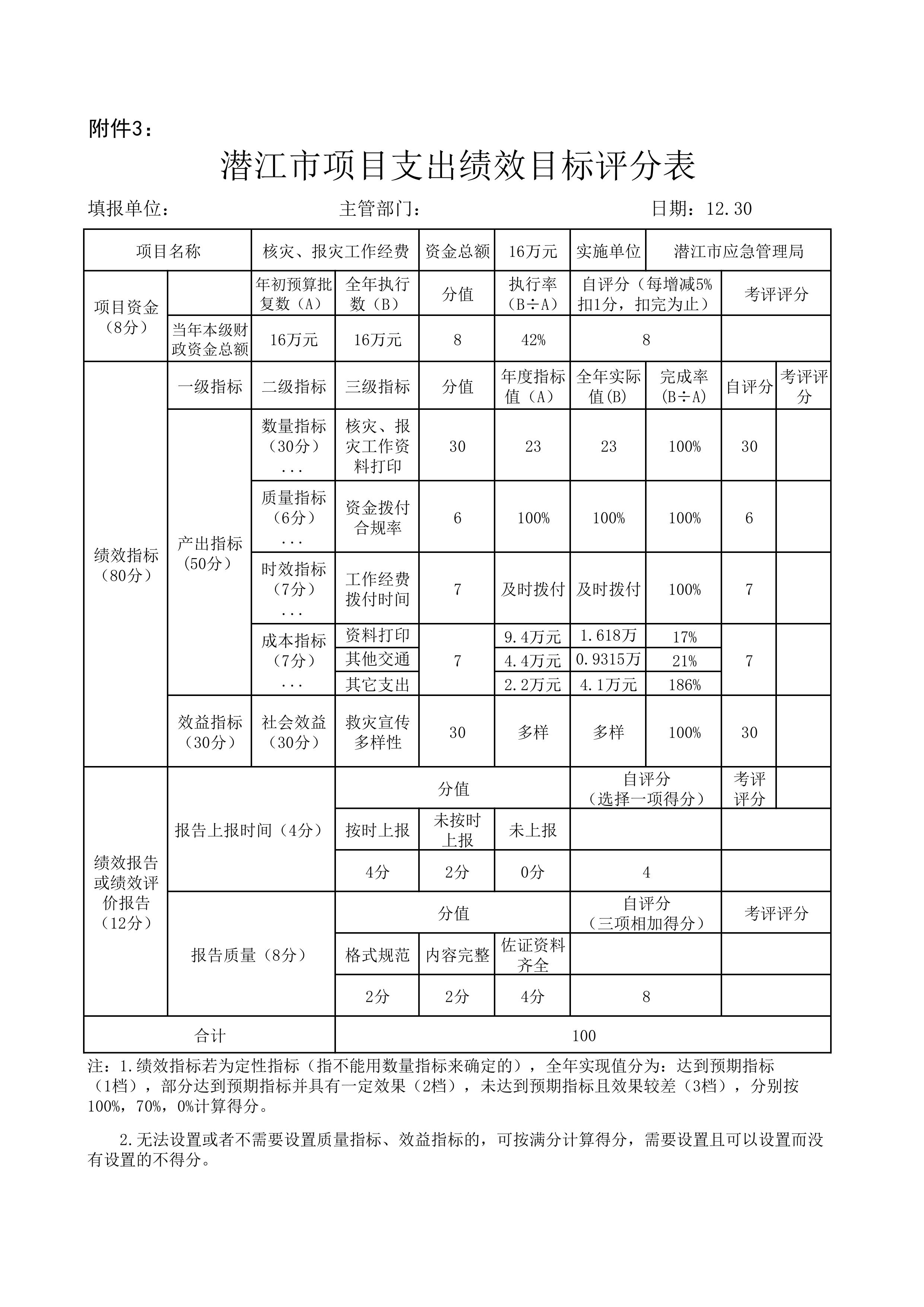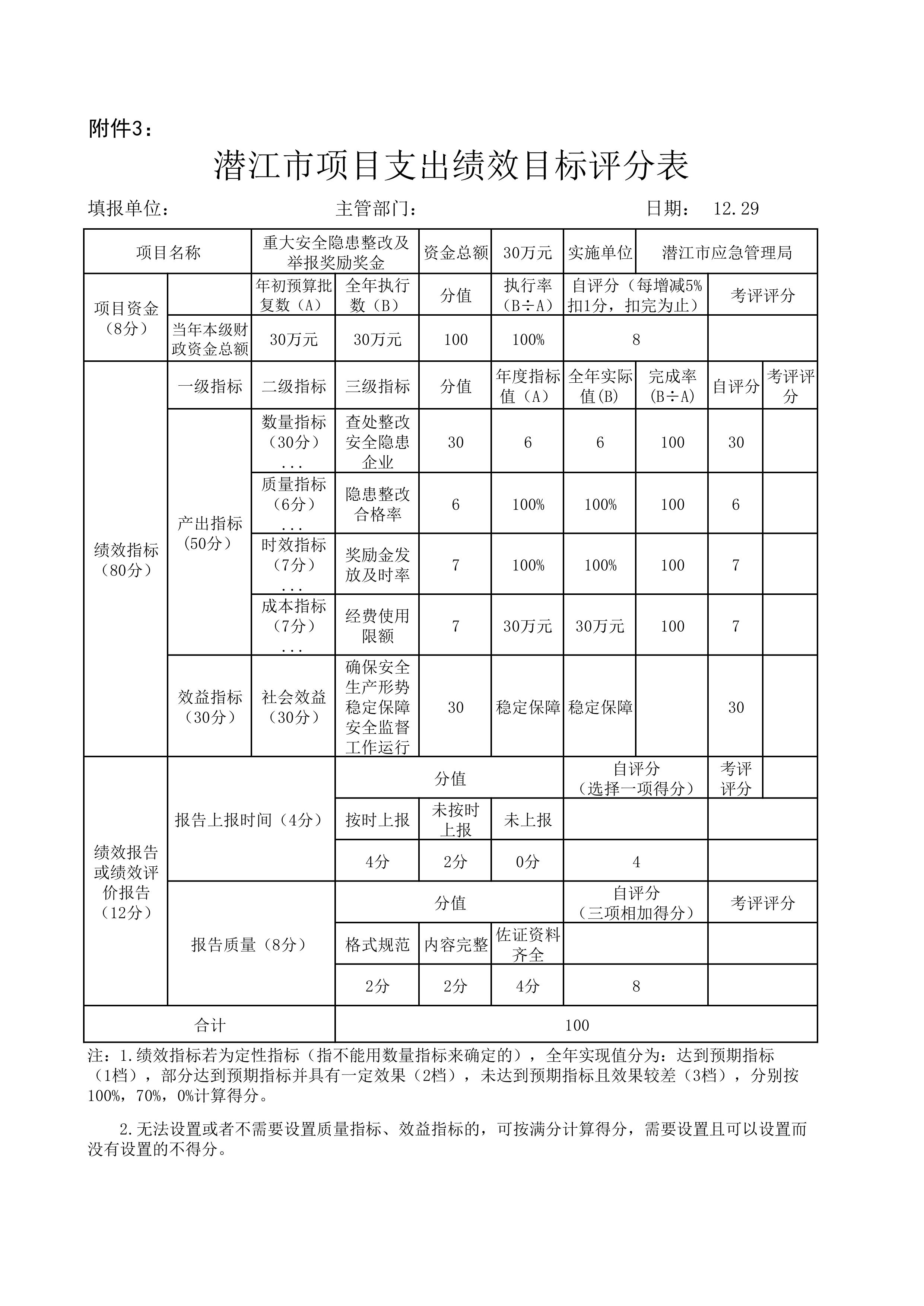 按照潜江市财政局《2022年预算绩效管理年度目标考核工作的通知》(潜财绩﹝2022﹞8号)的内容,结合本项目支出绩效目标完成情况,经过自查自评,2022年度安委会办公室工作经费自评得分100分。
