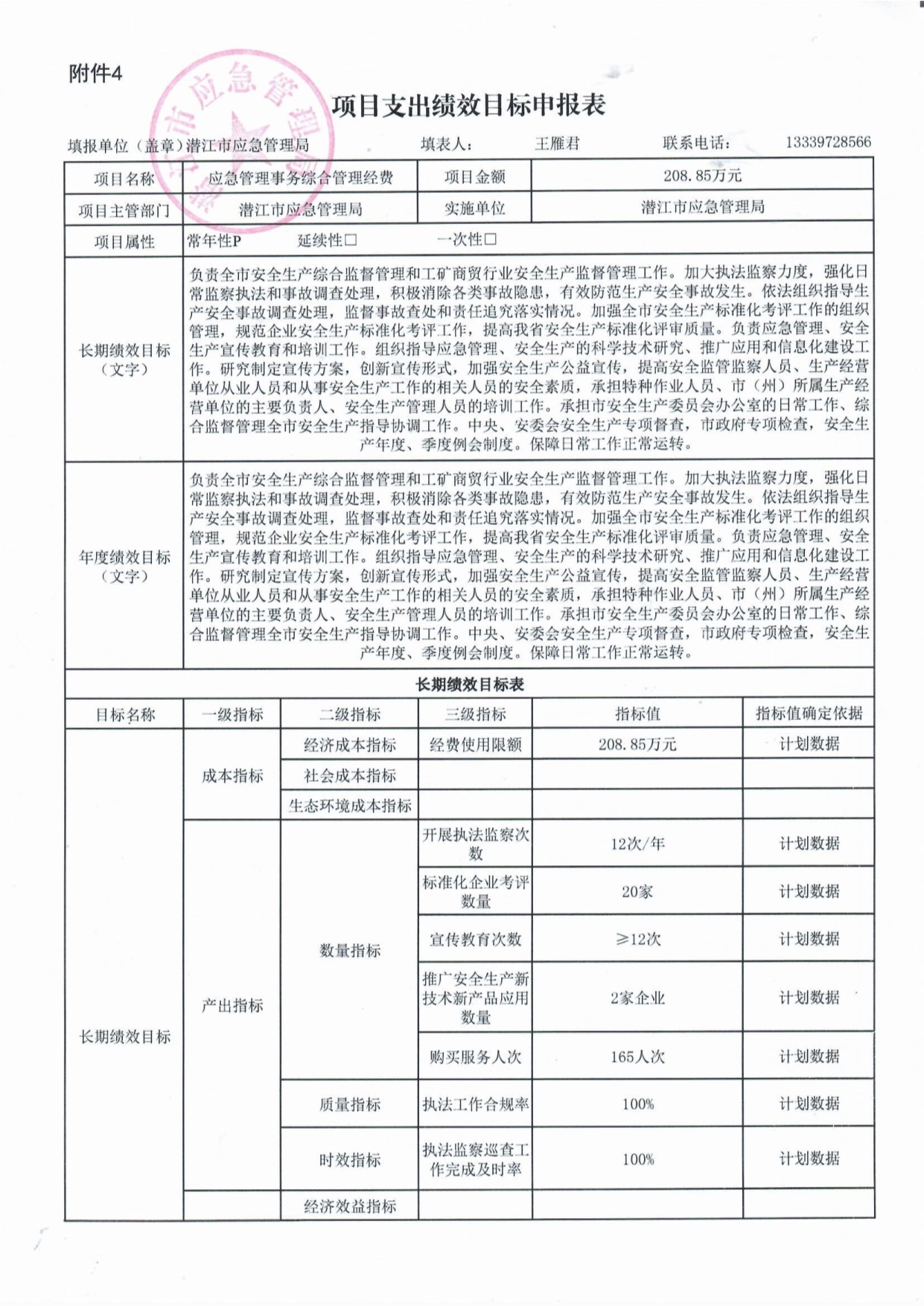2.市财政局拨付我局2023年应急管理事务综合管理经费208.85万元。项目由《安全生产应急救援管理经费》4.76万元、《办公场所、救灾物资仓库租赁及物业、水电费》23.1万元、《安全生产教育宣传经费》16.9万元、《安全生产行政执法监察经费》79.2万元、《安委会办公室工作经费》5.39万元、《重大安全隐患整改及举报奖励奖金》10万元、《森林防灭火指挥部办公室工作经费》3.5万元、《核灾、报灾工作经费》16万元、《防汛抗旱应急资金》20万元、《应急调度经费》30万元整合。