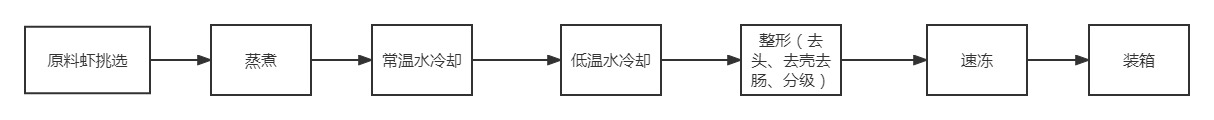 (1)液氮速冻工艺流程:虾仁速冻生产工艺主要包括原料虾挑选、蒸煮、常温水冷却、低温水冷却、去头去壳肠分级、速冻、装箱等7个工序。