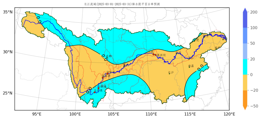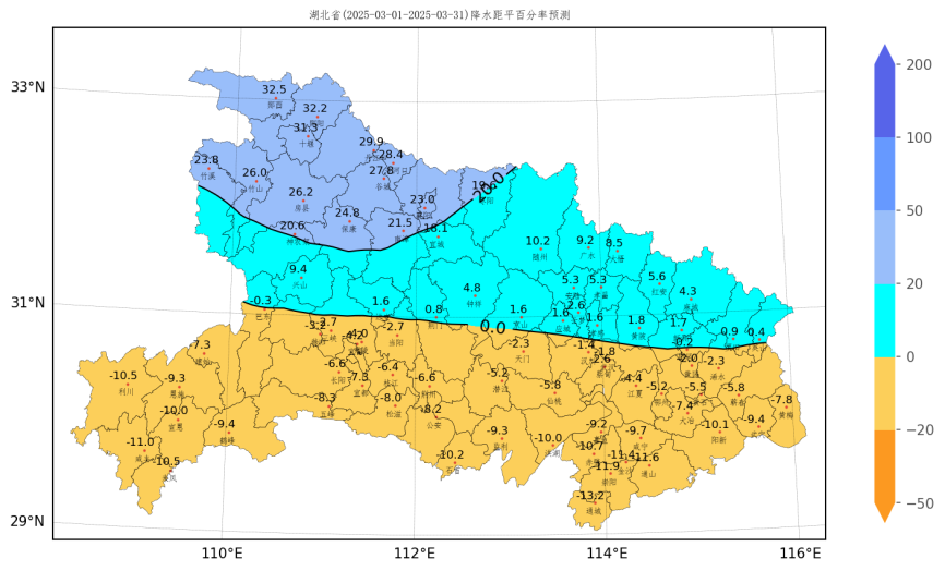 湖北省各县市2025年3月降水距平百分率预测图(%)