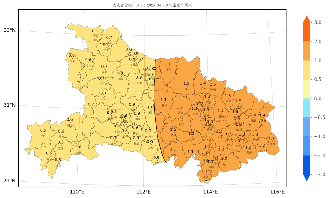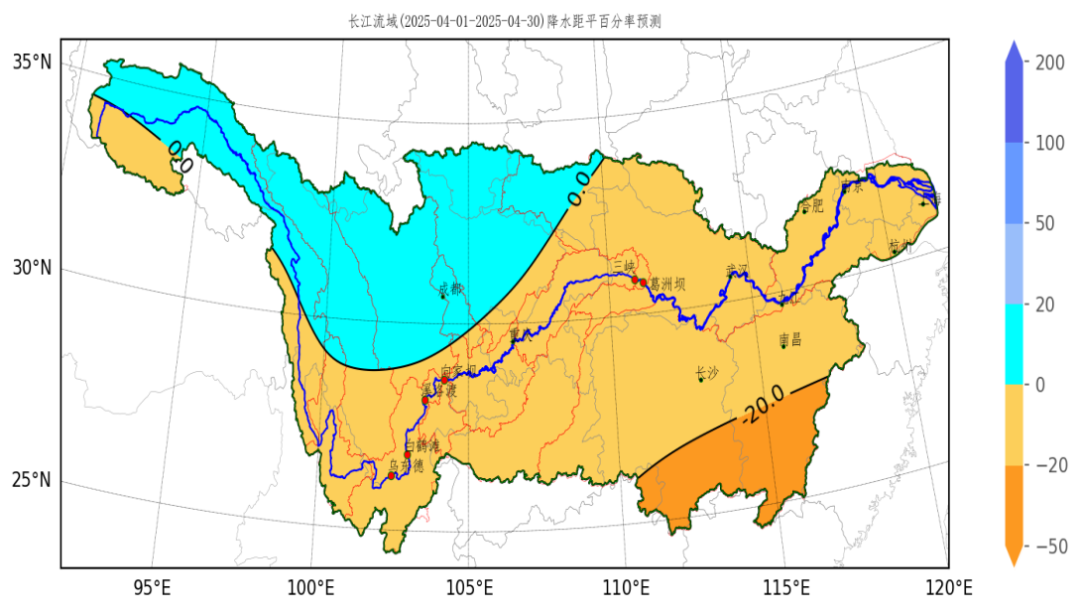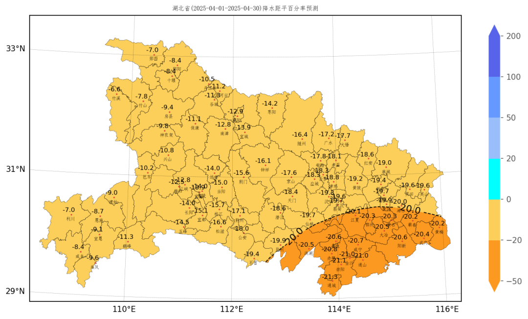 湖北省各县市2025年4月降水距平百分率预测图(%)